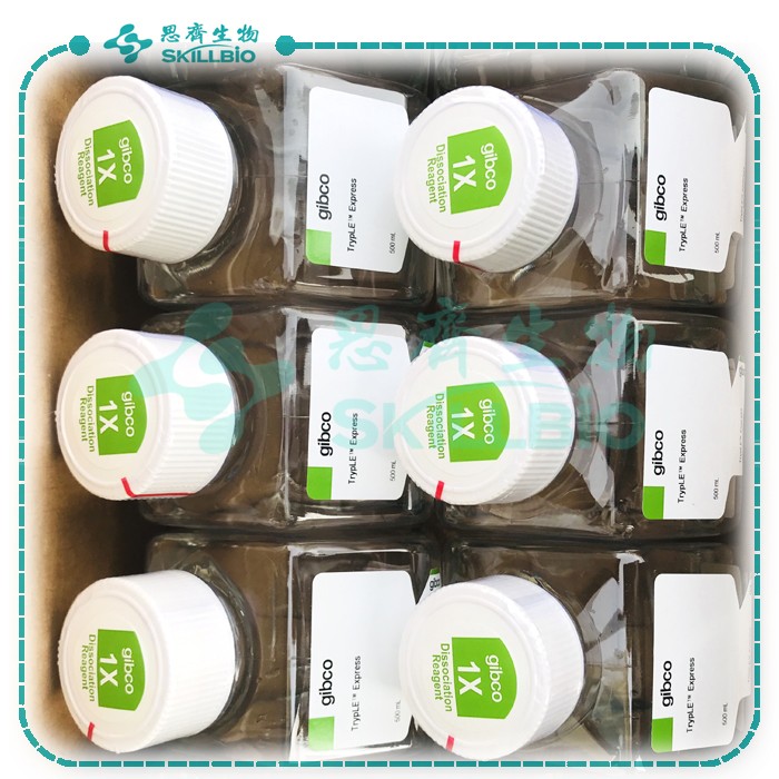 TrypLE™ Express is an animal origin-free, recombinant enzyme used for dissociating a wide range of adherent mammalian cells, including CHO, HEK 293, A529, primary human keratinocytes, and embryonic stem cells. TrypLE™ Express cleaves peptide bonds on the C-terminal sides of lysine and arginine, and is a direct replacement for trypsin. Its exceptional purity increases specificity and reduces damage to cells that can be caused by other enzymes present in some trypsin extracts. We offer a variety of TrypLE™ formulations for a range of cell culture applications. Compared to trypsin and other dissociation reagents, TrypLE™ Express is: